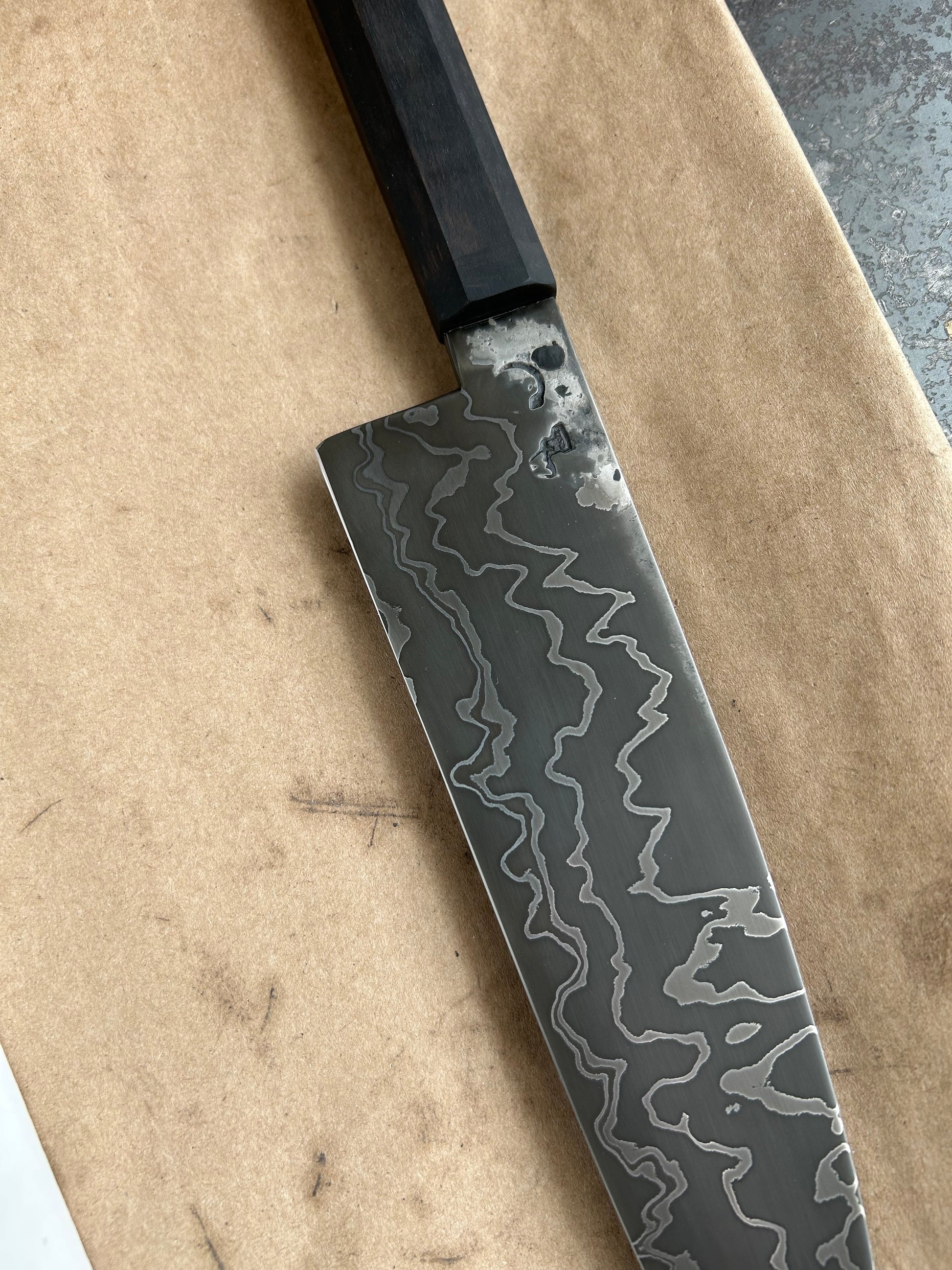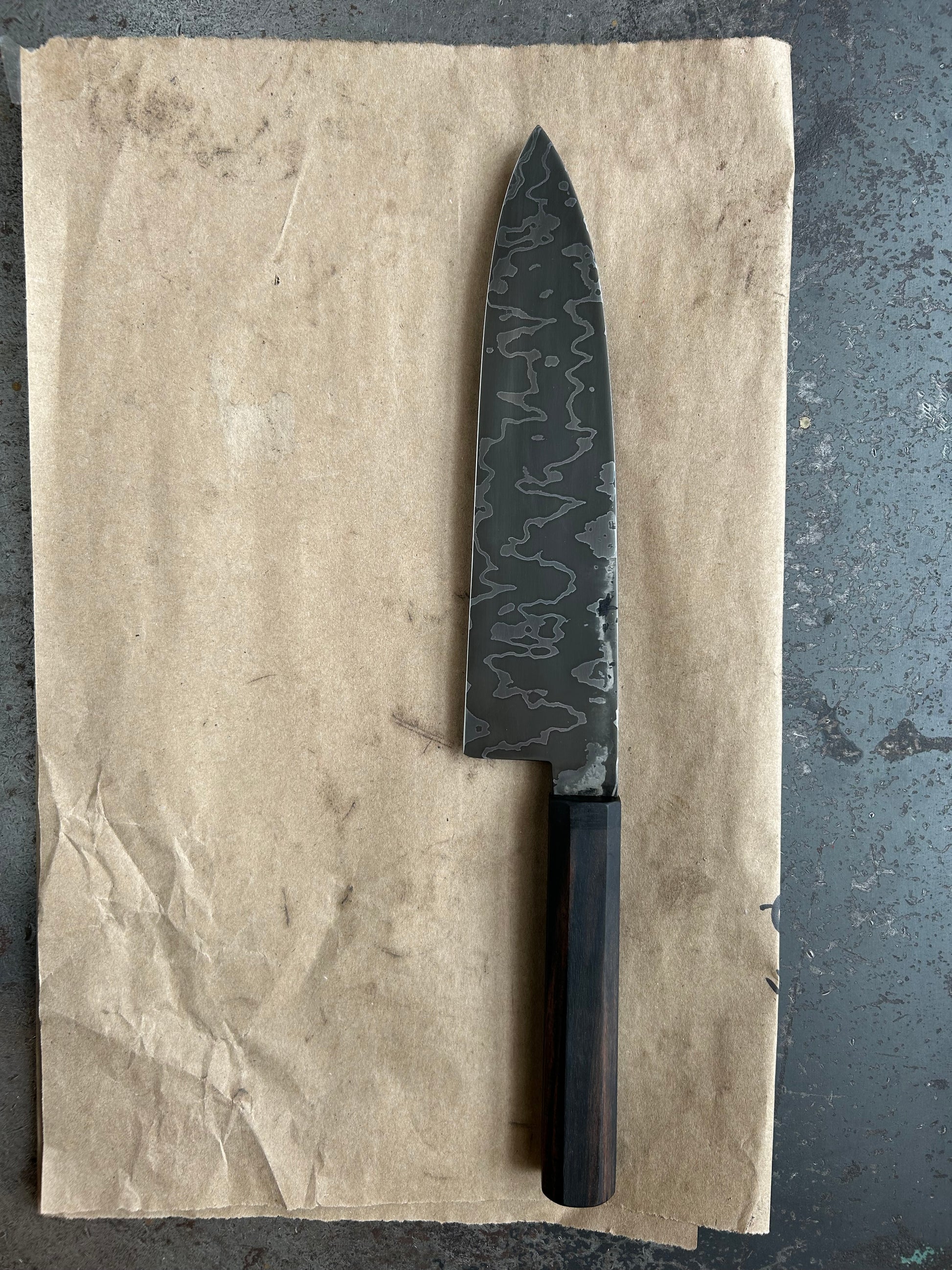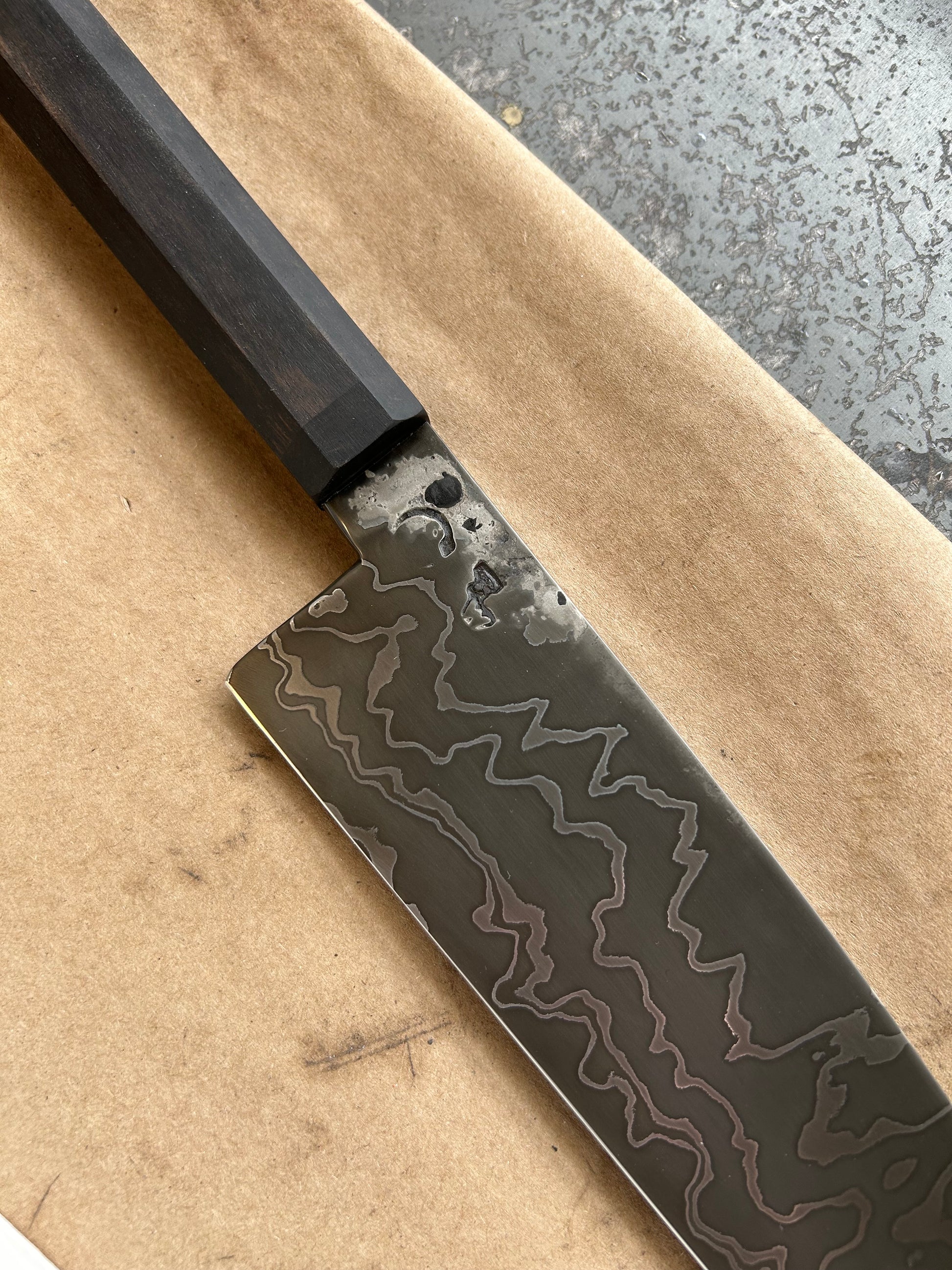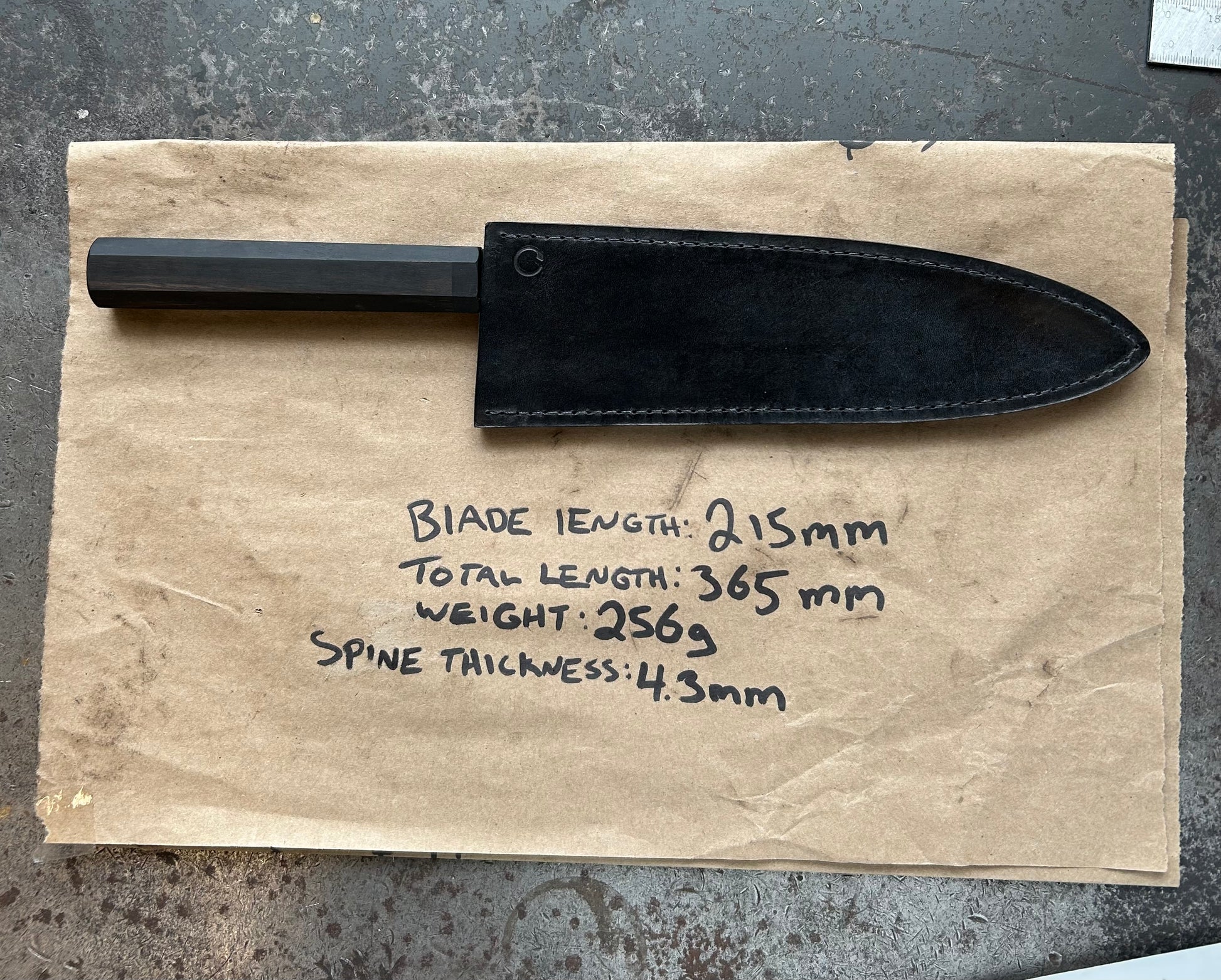 This blade has been forged from 30 layers of high carbon steel, laminated in house. This long blade has a dramatic distal taper, rather stout at the thickest part of the spine and quite thin behind the cutting edge. Although it is suitable as an all around knife, it is both larger and heavier than my standard chef knife and as such will be best suited for heavier kitchen tasks such as prep of root vegetables, butchery and for those who prefer blade forward experience regarding the balance point.