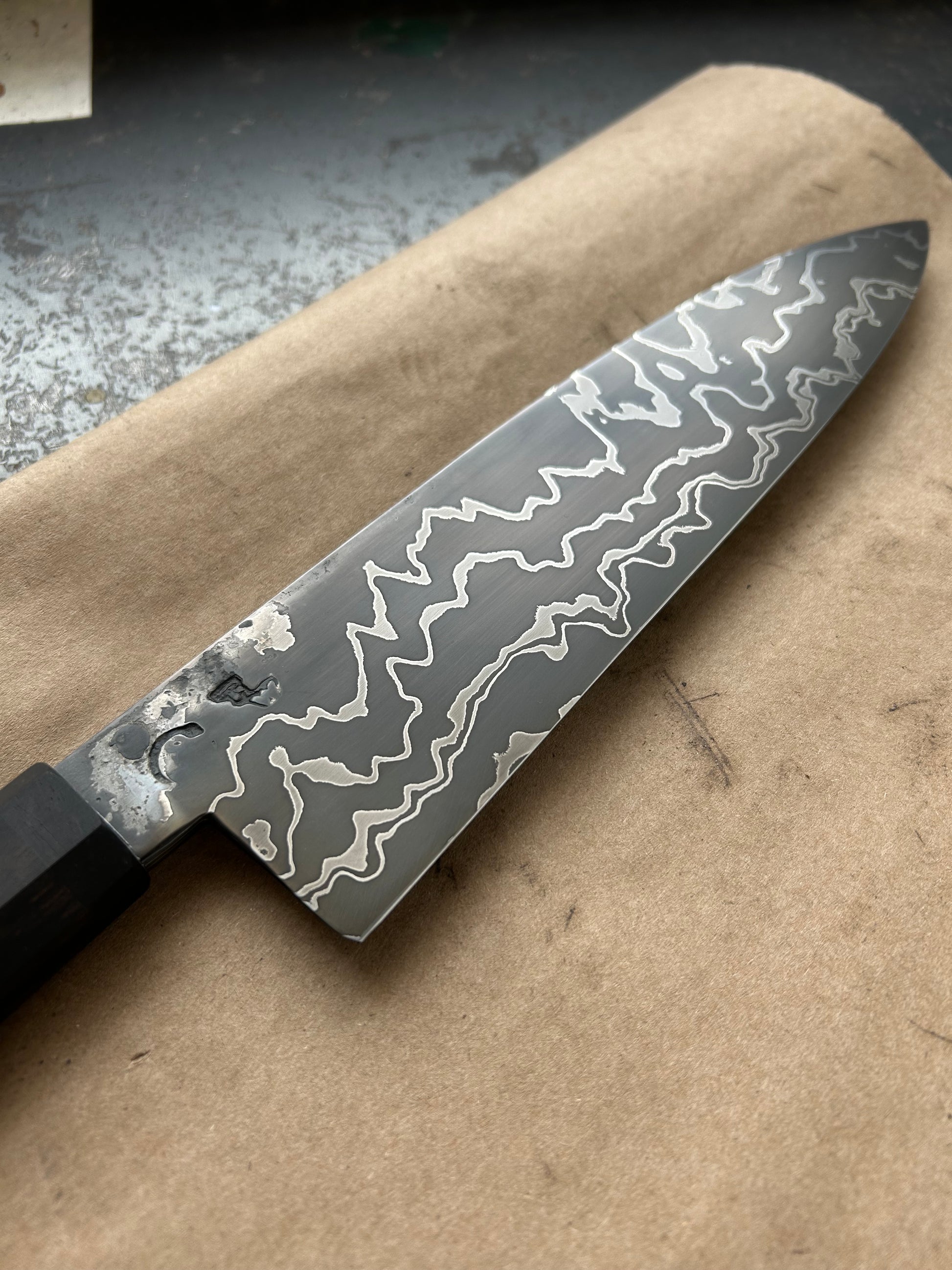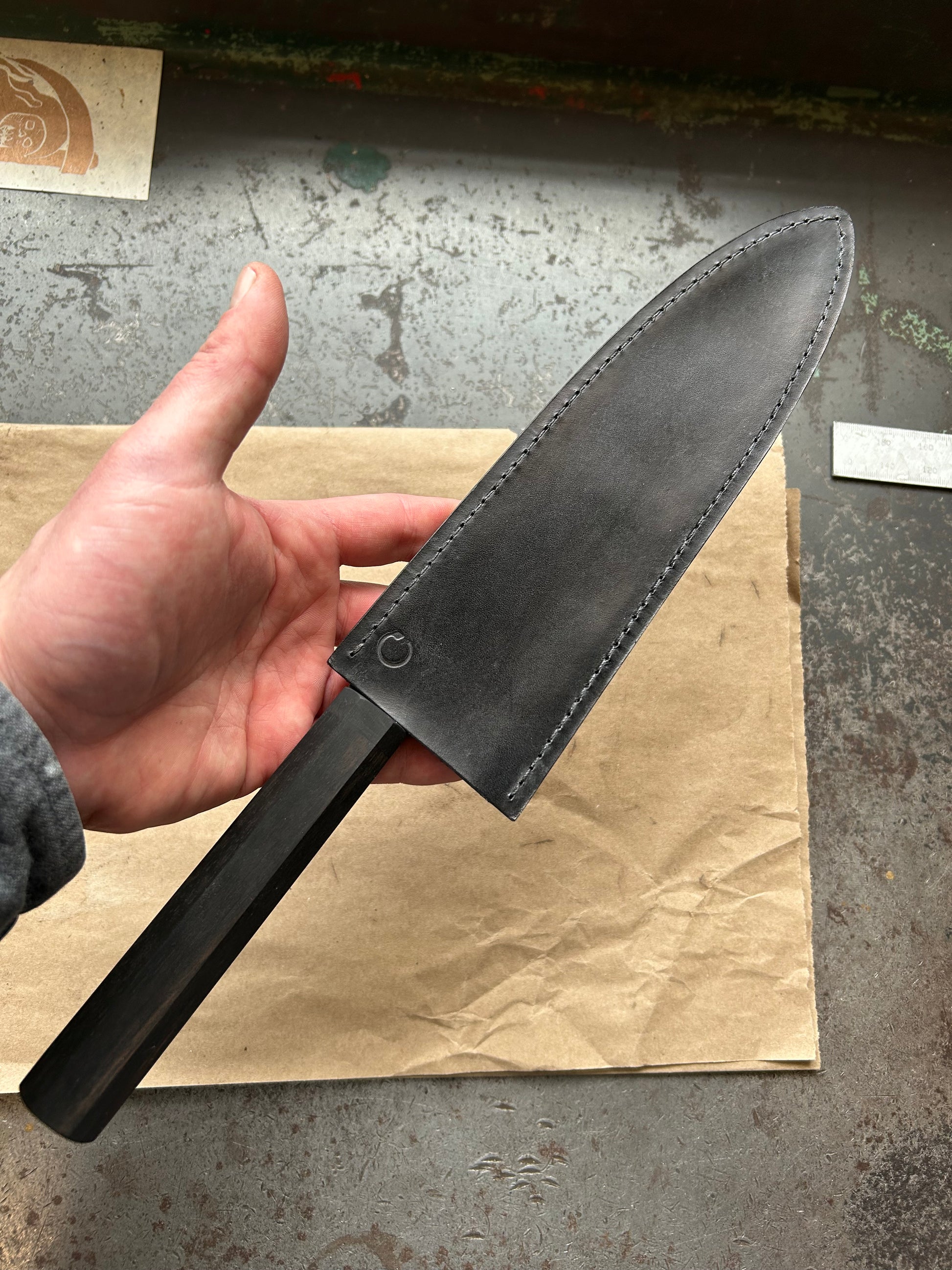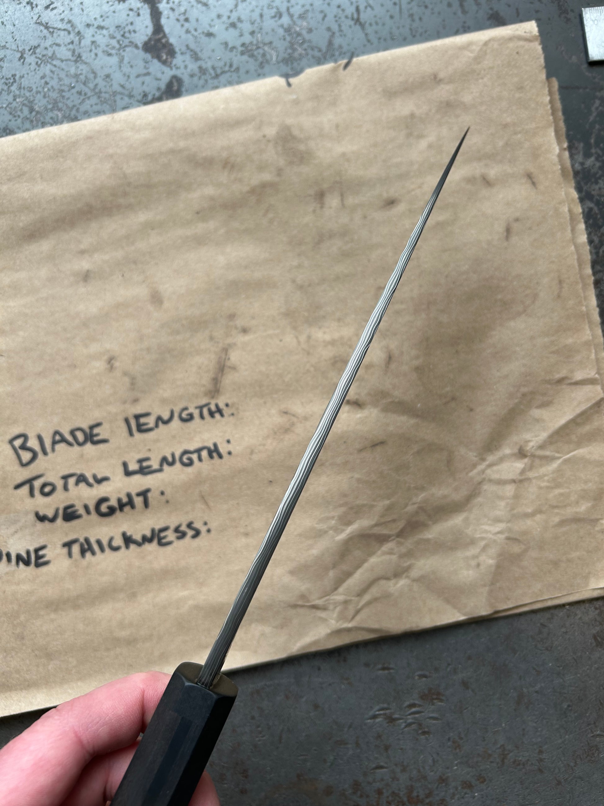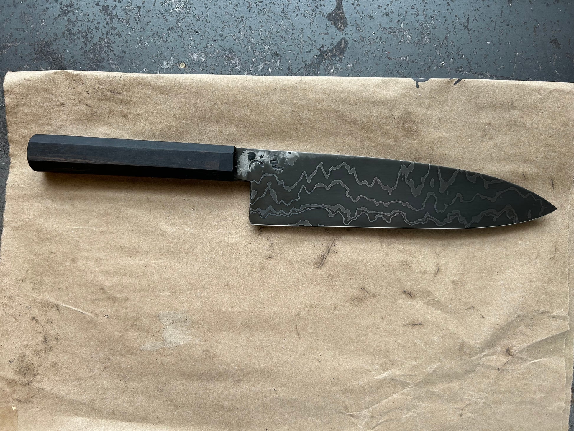 This blade has been forged from 30 layers of high carbon steel, laminated in house. This long blade has a dramatic distal taper, rather stout at the thickest part of the spine and quite thin behind the cutting edge. Although it is suitable as an all around knife, it is both larger and heavier than my standard chef knife and as such will be best suited for heavier kitchen tasks such as prep of root vegetables, butchery and for those who prefer blade forward experience regarding the balance point.