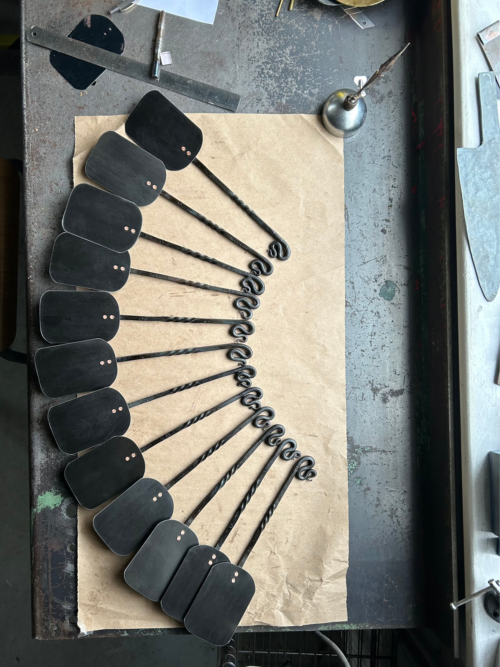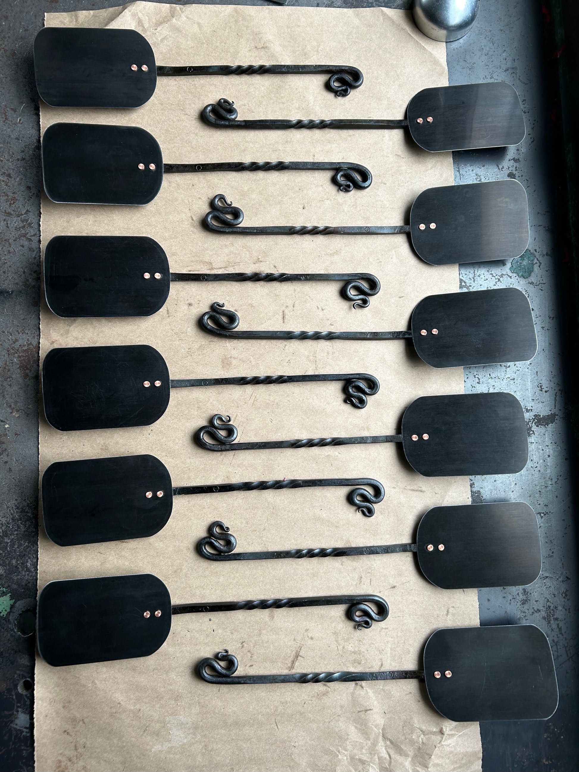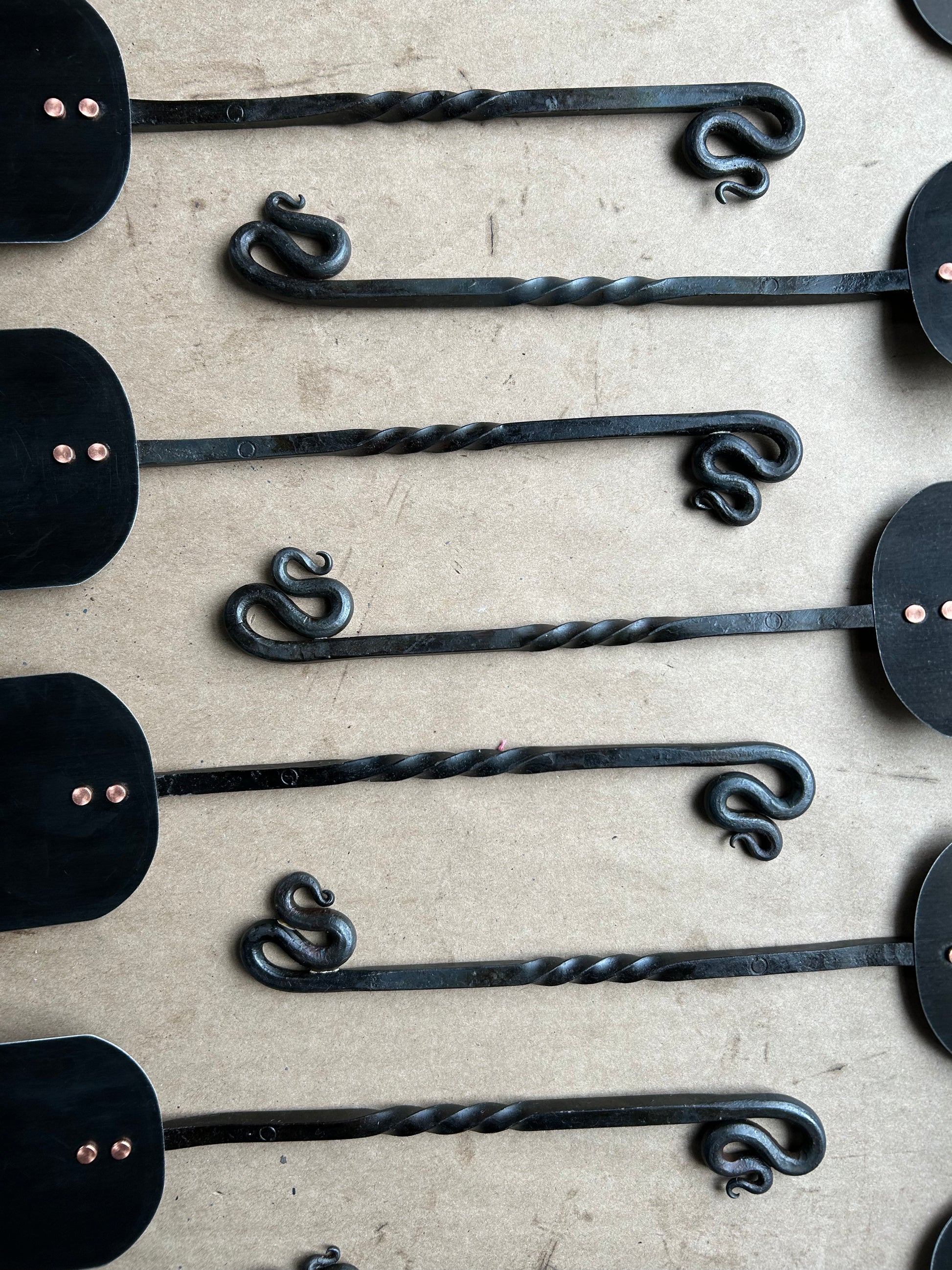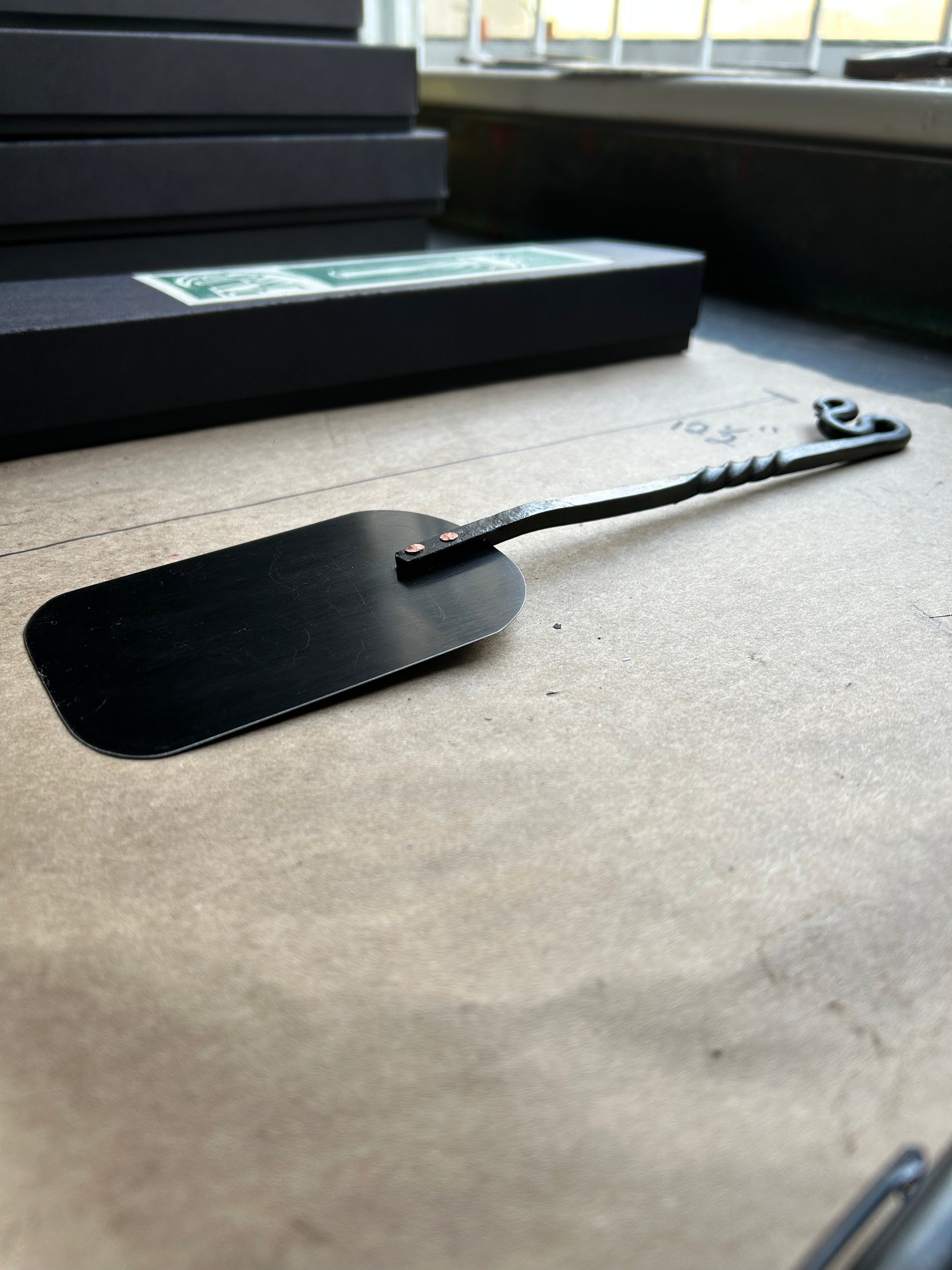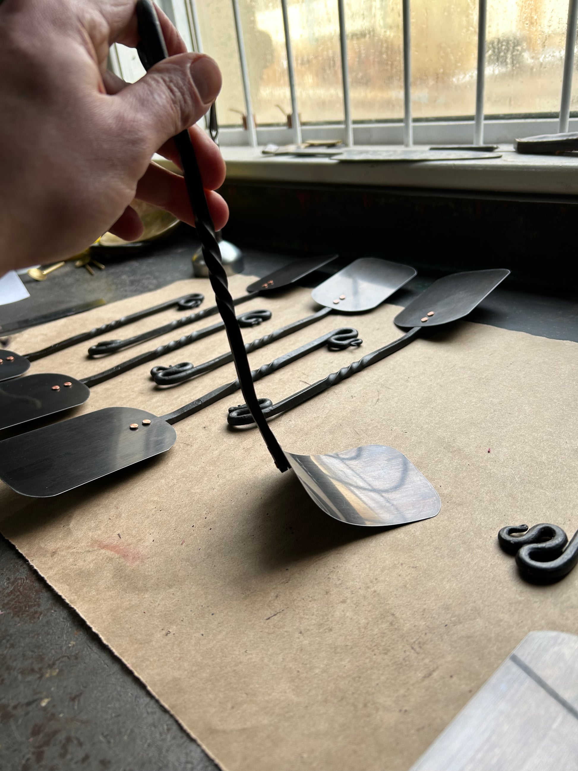 The handle of this spatula has been forged in the Crane Culinary workshop using time honoured blacksmithing techniques. Each one is made entirely by hand and hammer demonstrating a unique series of twists, finials and tapers.