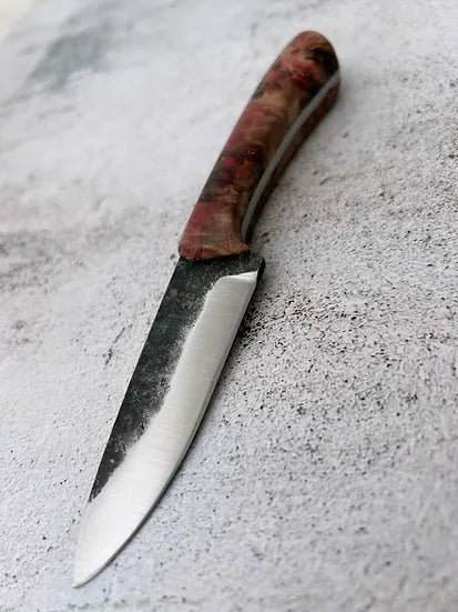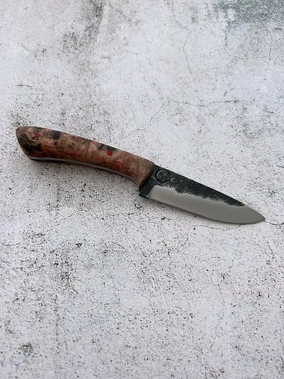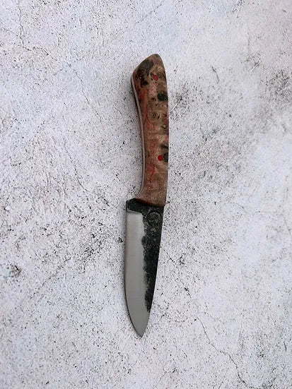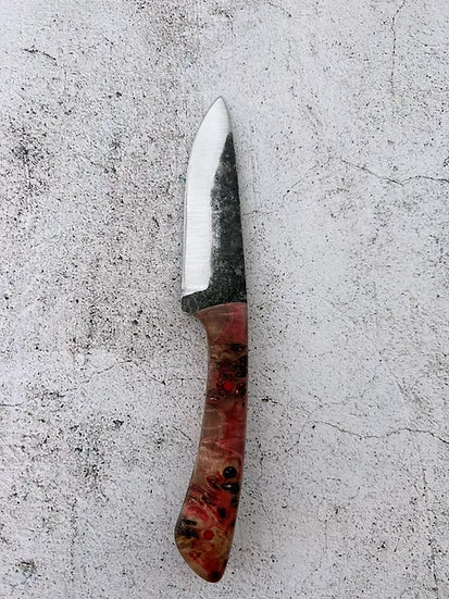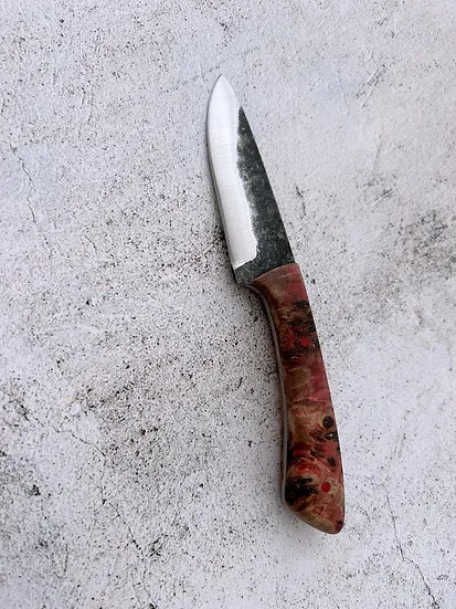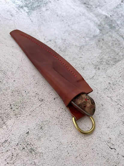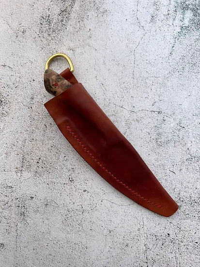 This small hunter is designed to be a tough and reliable companion. The 1084 high carbon steel will age beautifully with proper care and can hold a keen edge. Featuring a convex grind, brightly coloured pins and a stabilized mappa burl wood handle. The sheath is saddle stitched by hand to be extra tough, and the veg tanned leather with solid brass ring will age beautifully with use.